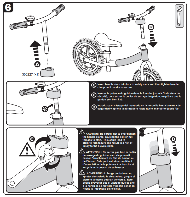 Step 5 of balance bike assembly – install the seat, adjust height so feet are flat on the ground, and tighten securely.